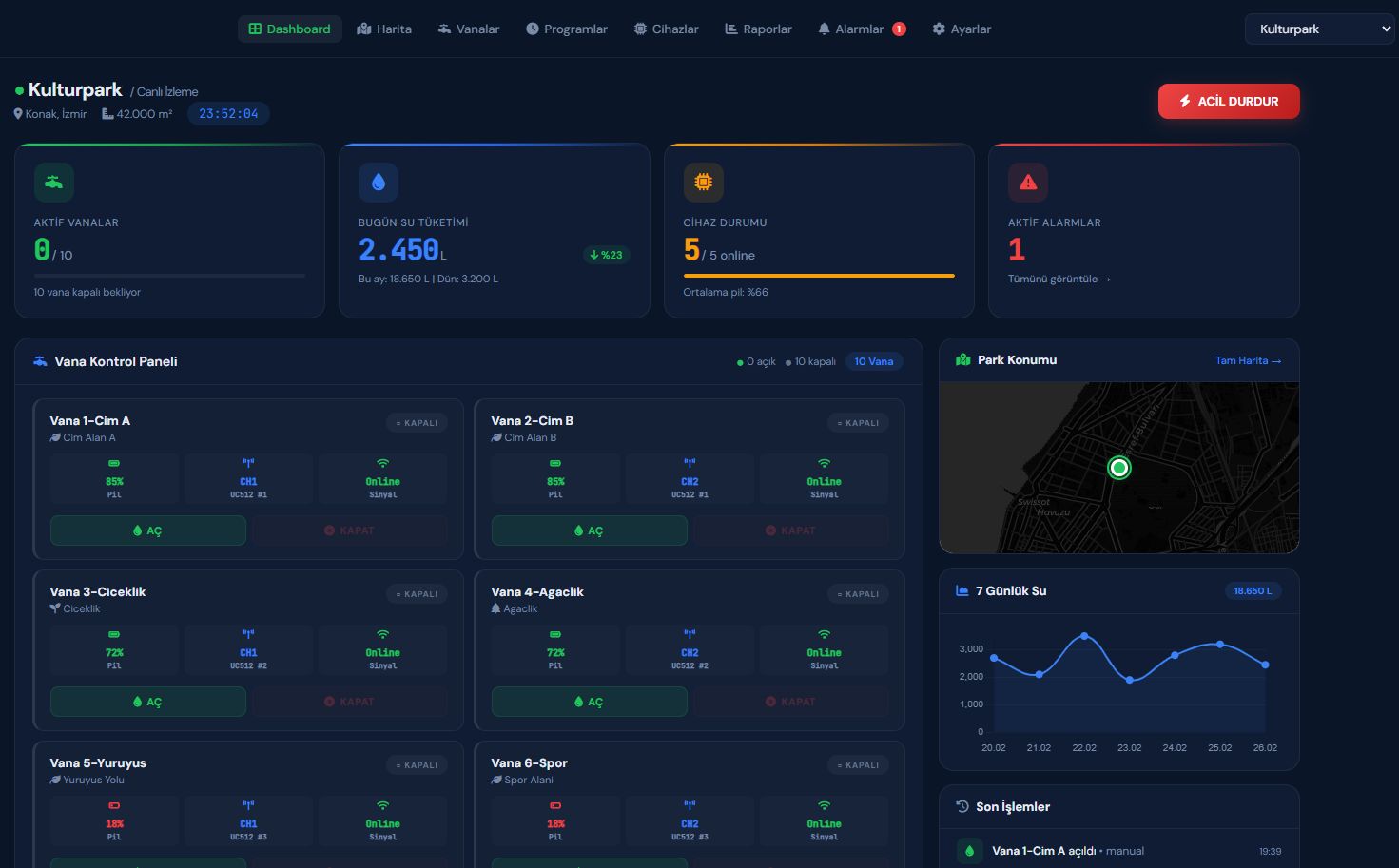 Geliştirdiğimiz Akıllı Sulama Sistemleri Yazılımı, park, bahçe, refüj alanları ve tarım arazilerinde sulama süreçlerini tamamen dijital ve otomatik hale getirir. Su tasarrufu sağlar, iş gücünü azaltır ve bitki sağlığını maksimum seviyeye çıkarır.